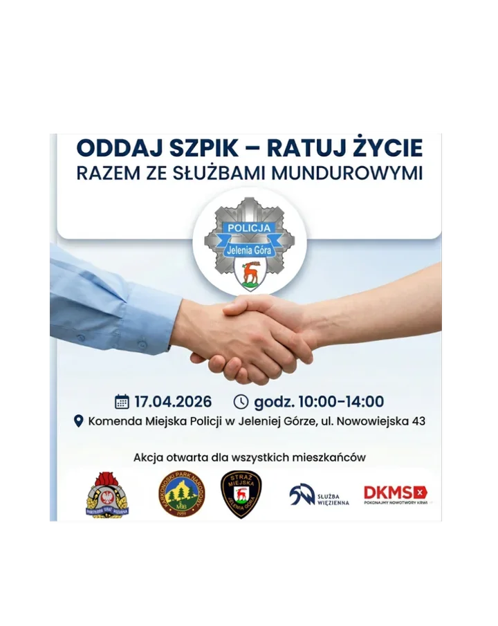 W Komendzie Miejskiej Policji w Jeleniej Górze 17 kwietnia ruszy akcja rejestracji potencjalnych dawców szpiku. Do inicjatywy dołączają funkcjonariusze Aresztu Śledczego, jeleniogórscy strażacy, strażnicy Karkonoskiego Parku Narodowego i strażnicy miejscy. Organizatorzy podkreślają, że cały proces zajmuje tylko kilka minut i jest całkowicie bezbolesny.