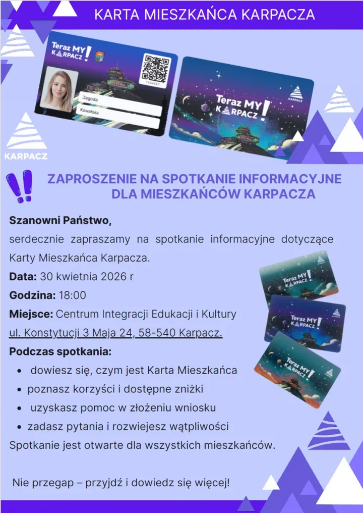 Spotkanie informacyjne odbędzie się 30 kwietnia o godzinie 18:00 w Centrum Integracji Edukacji i Kultury przy ul. Konstytucji 3 Maja 24 w Karpaczu. Organizatorzy zapowiadają, że podczas wydarzenia przedstawione zostaną założenia programu, zasady jego funkcjonowania oraz sposób korzystania z Karty Mieszkańca.