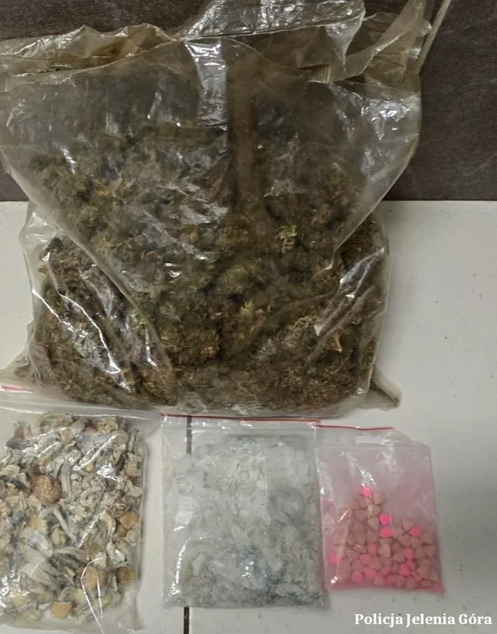 Przed budynkiem, w którym mieszkał, 26-latek palił tzw. skręta, gdy podjechali policjanci z Jeleniej Góry. Po wejściu do mieszkania i pomieszczenia gospodarczego funkcjonariusze zabezpieczyli marihuanę, metamfetaminę, kilkadziesiąt tabletek MDMA i grzyby halucynogenne. Z tej ilości można było przygotować ponad 3600 porcji handlowych.