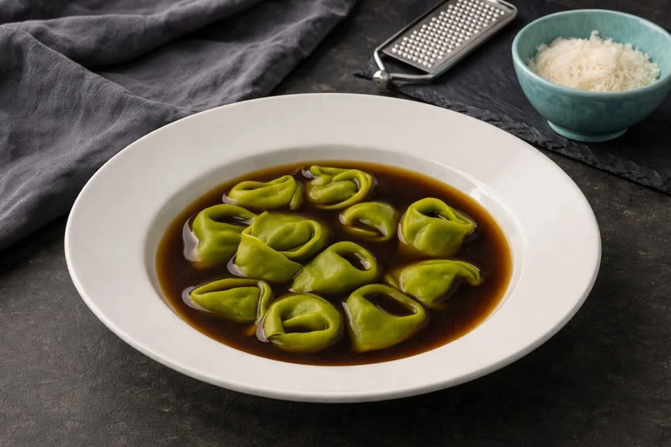 - Zielone tortellini in brodo – pierożki faszerowane szynką i parmezanem, podane w esencjonalnym bulionie,